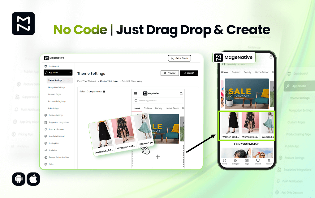 MageNative’s drag and drop mobile app builder lets you go from “just an idea” to a fully functioning app before your next product even hits the shelf.