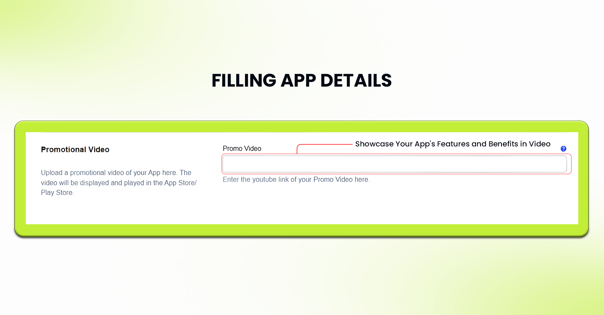 Here you can upload a promotional video that showcases features and benefits of your mobile app. This video will be available in the app store and can significantly impact user interest.